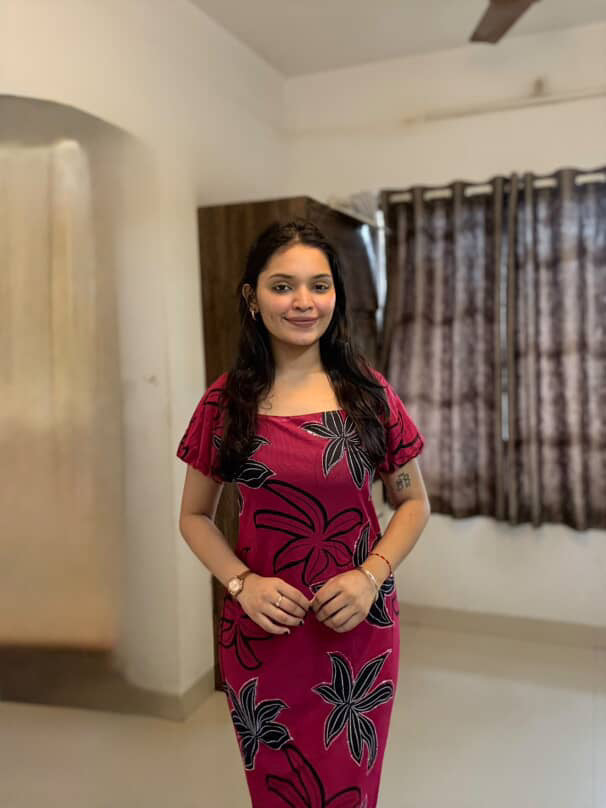 A chic and comfortable midi dress in deep pink with bold floral prints, perfect for casual outings or relaxed gatherings. The square neckline and flutter sleeves add a feminine touch to this effortlessly stylish look.